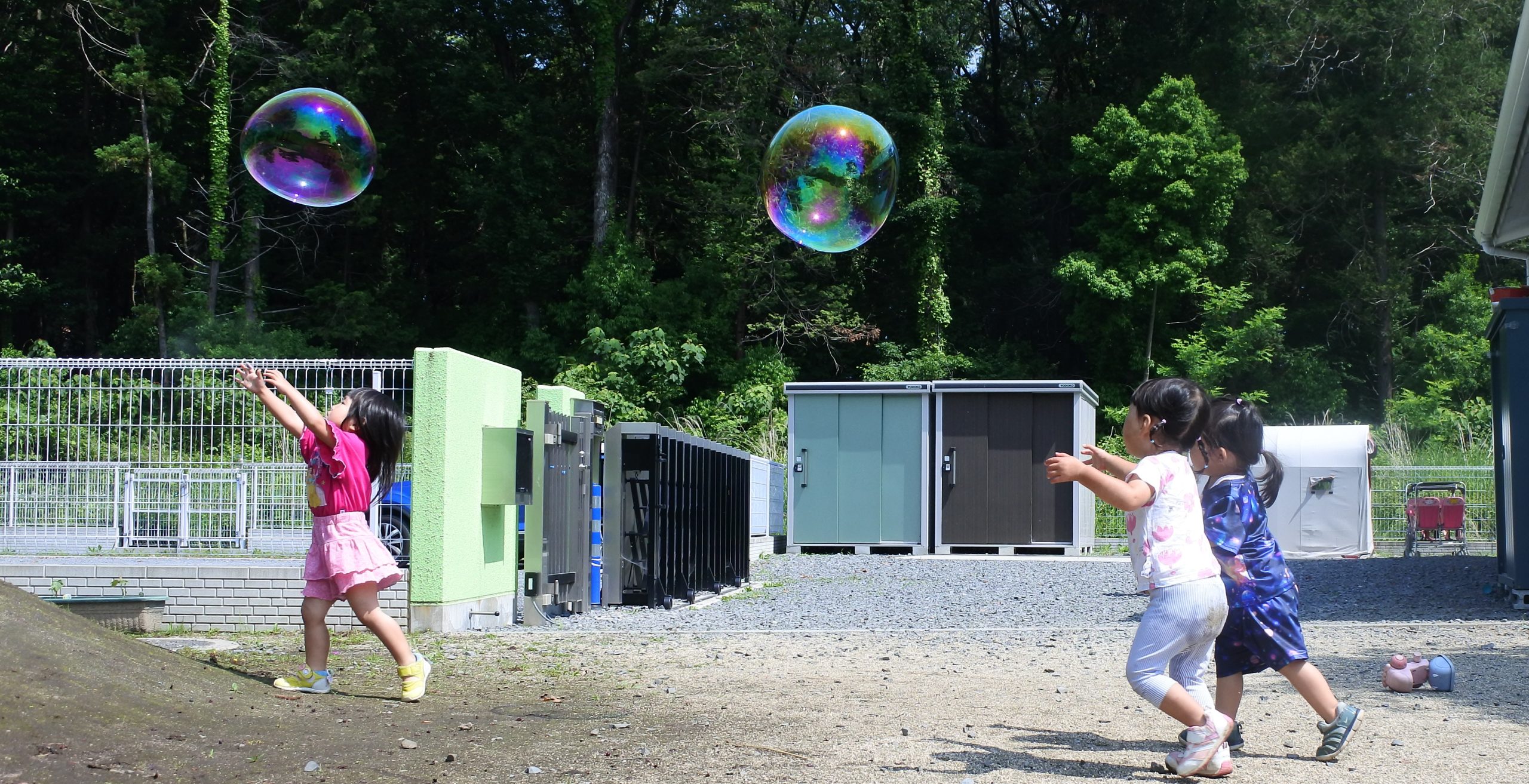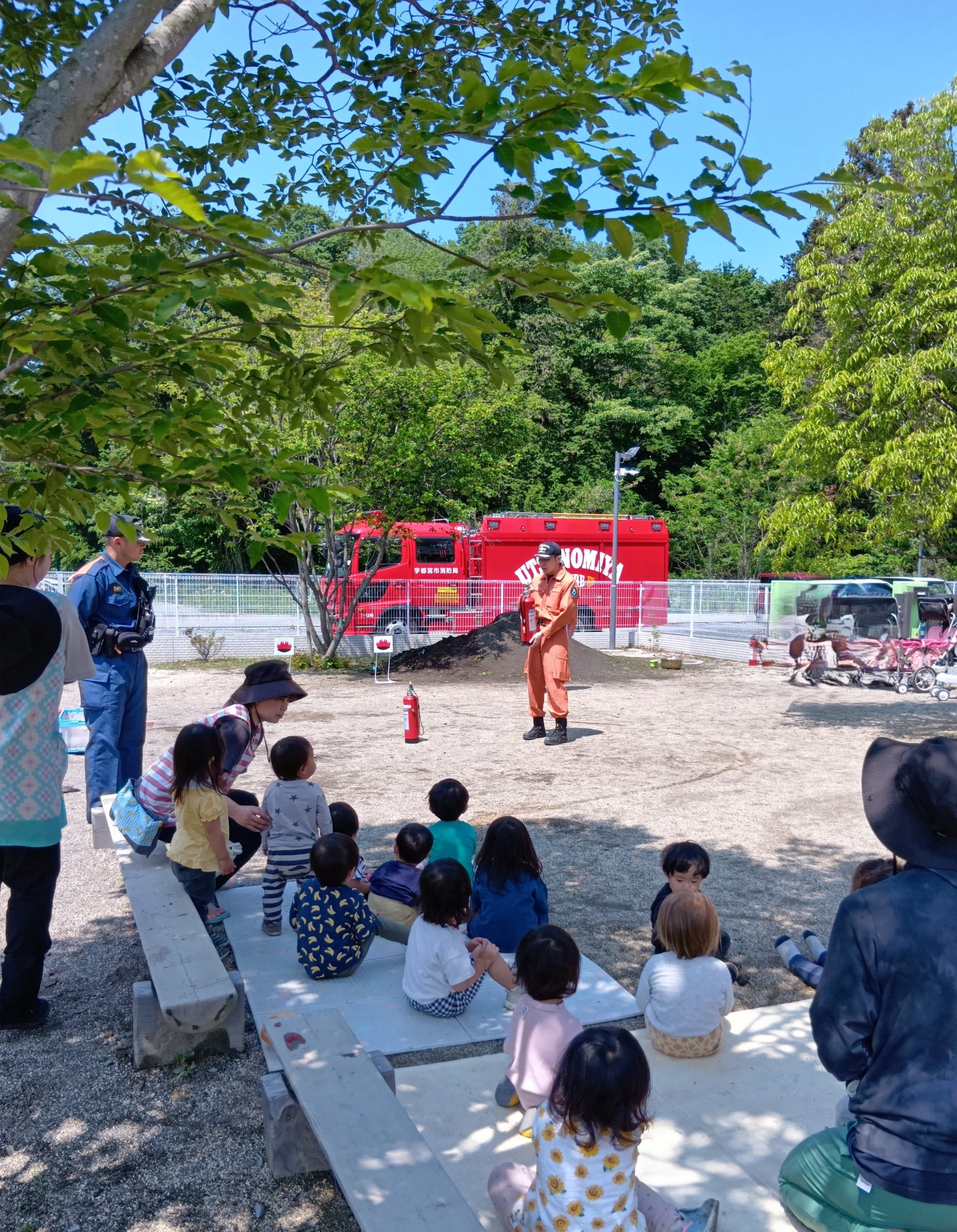 本日、避難訓練を実施しました。宇都宮南消防署簗下分署の職員のみなさんが、とてもかっこいい消防車両とともに来園してくださり、訓練を見守ってくださいました。子どもたちは大興奮で迎えます。訓練自体は、泣いてしまう子もいましたが、概ね落ち着いて行動することができました。写真は、消火器をつかった消火訓練(当園職員が実施しました)を真剣に見つめる子どもたちです。