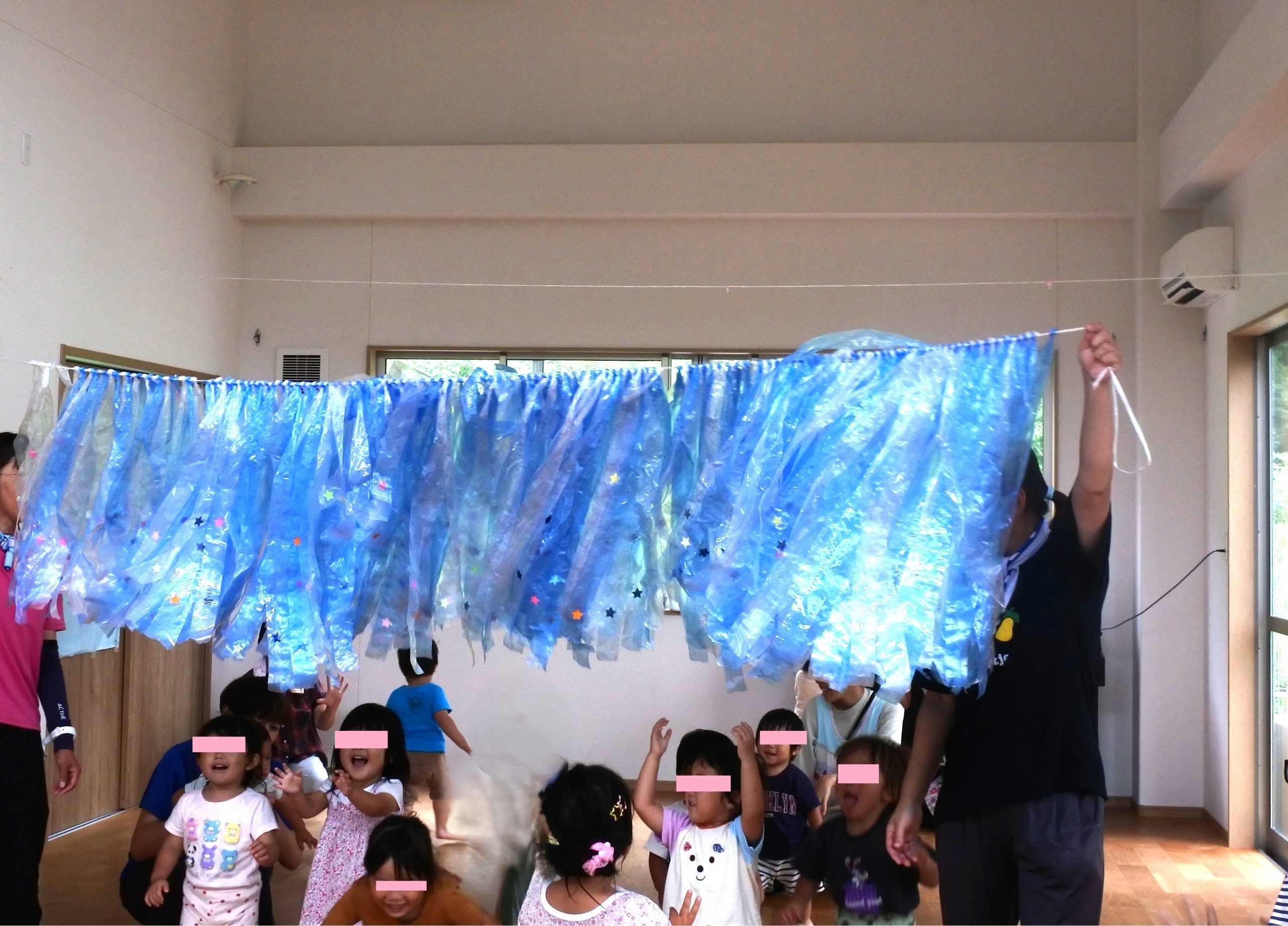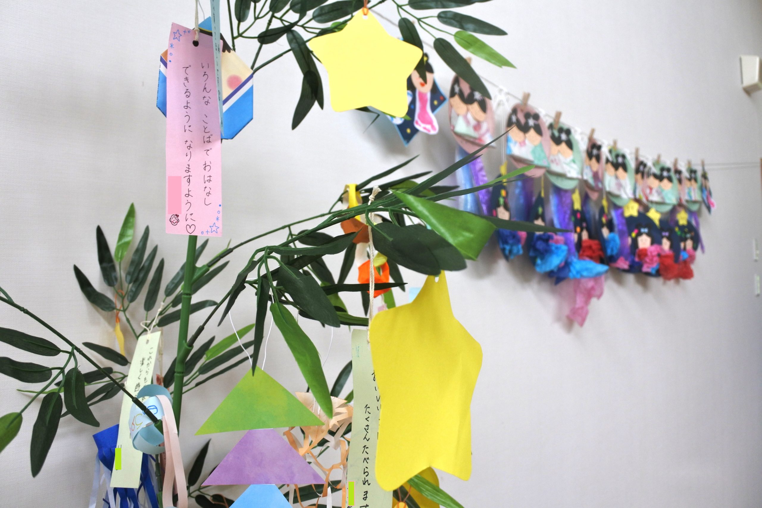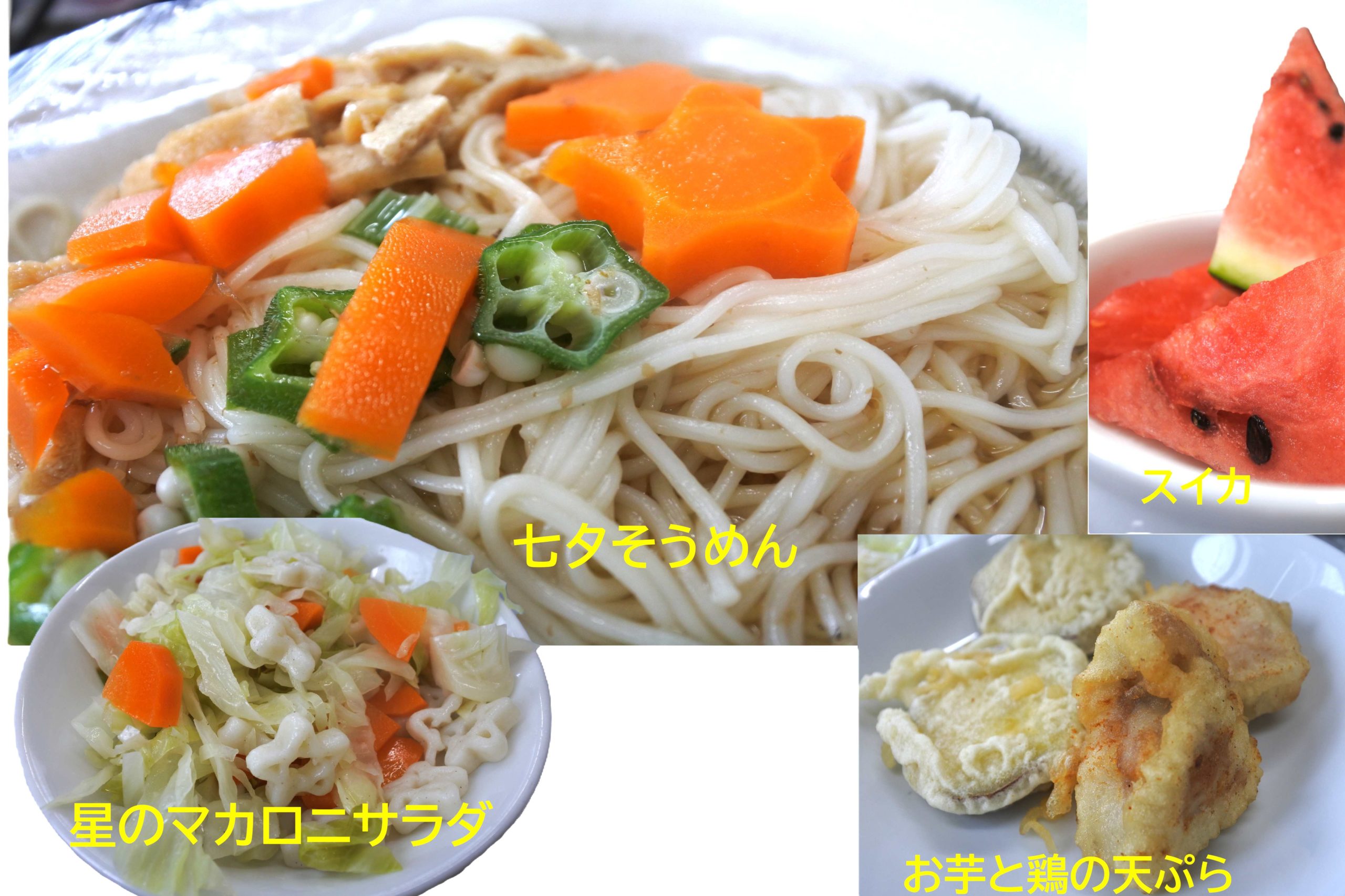 特別行事笹の葉さらさら♪七夕まつり 2025.07.07 本日、七夕まつりを実施しました。事前に保護者の皆さんに園児のお願いごとを短冊に書いてもらっていました。紙芝居を読んでもらい、七夕の歌を歌い、短冊を飾りました。天の川をくぐる遊びも盛り上がりました。給食は「七夕そうめん」「星のマカロニサラダ」「お芋と鶏の天ぷら」「スイカ」、おやつは「豆乳みかんババロア」「トウモロコシ」とイベント感満載です。みんなおいしくいただきました。 前の記事 一覧に戻る 次の記事