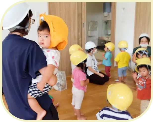 月に1回、様々な場面を想定しながら避難訓練を実施しています。(年に1回程度、引き渡し訓練も実施します。)子どもたちの安全・安心を守るため、職員自身の救命訓練や人権研修なども定期的に実施しています。