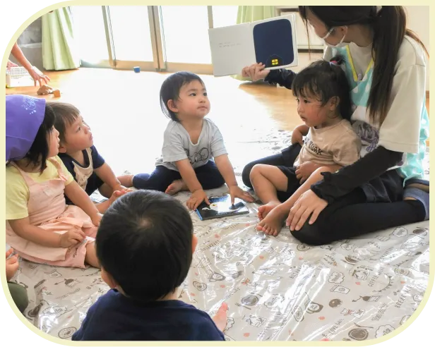 絵本は創造力、語彙力、好奇心、感受性などいろんな能力を伸ばす源です。月齢に合わせた絵本を多数用意し、機会があるごとに読み聞かせを実施しています。