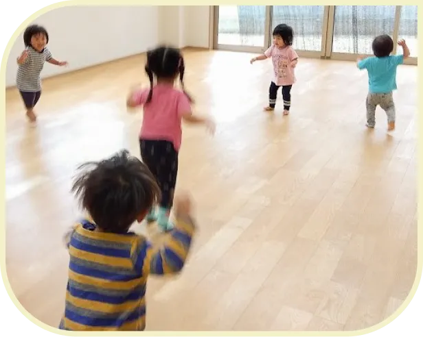 ピアノに合わせたリズム遊びや手作りのアスレチックなどを通して、丈夫でしなやかな体づくりをめざします。