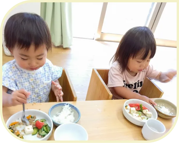 子どもの発達に合わせながら地産地消、低農薬で素材を味わう献立を意識しています。食器も県内の土を使った陶器を使用するなど、様々な視点から食育を心掛けています。また、その日に使用される野菜などを自分たちで洗ってみたりと、つながりをもって食を感じられるような工夫も心掛けています。