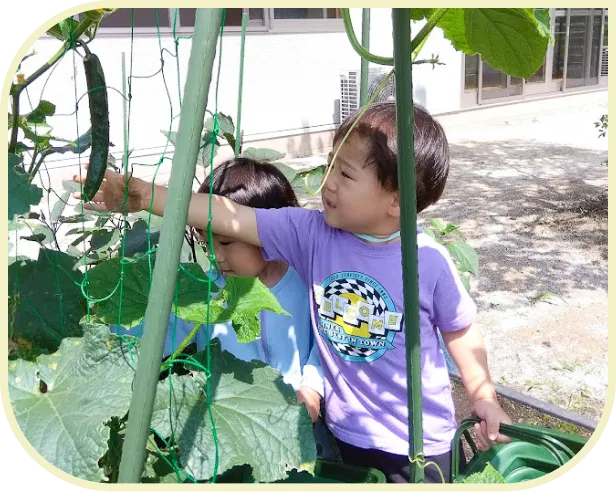 きゅうりやなすスイカ、サツマイモなど様々な野菜を園庭農園で育てています。給食では避けていた食材も、自分たちで育てることによって食べられるようになる子どもがたくさんいます。